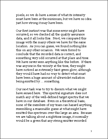 On a more personal note, it was an incredible experience. While the instruments didn't capture anything, each and every member of our field team certainly sensed the anomaly with our own faculties. The greenish glow was quite visible. It was pervasive, eerie, like something from out of this world. And the ultra-violet radiation was definitely there too. As you know, I am of Scandinavian heritage and am rather fair-skinned: I found myself looking rather tanned when I saw myself in the light of day today. We were in the presence of something extraordinary. We know nothing more about it from a scientific point of view than we did before, but it was not a total loss for me, because experiencing it had a different kind of value. There are still things in the world that we do not understand, we cannot explain, and apparently we also cannot record. It's actually a little reassuring for me to know that this is the case.